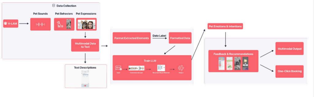 孙邻家认为美国的宠物市场很大,但是数字化程度不高。他最开始想做宠物方面的社区应用,中途 ChatGPT 在 2022 年 11 月横空出世,他于是想借助大模型的技术,来做宠物行为翻译,这一块当时在市场上还是空白。