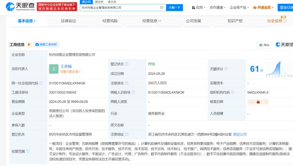事实上,闲鱼布局助贷业务早有端倪。天眼查 APP 显示:今年 5 月 28 日,淘宝旗下成立新公司 " 杭州闲鱼企业管理咨询有限公司 ",注册资本为 200 万元。而这一新公司,就是闲鱼借钱频道运营服务的主体。