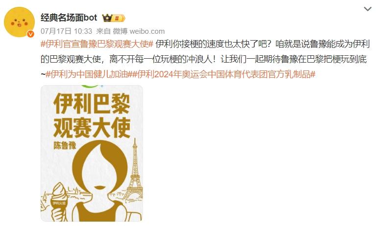而且,伊利在线上主打社媒互动和 " 听劝营销 "。网友们觉得运动员们的国风宣传照不错,要求 " 让这个硬照上包装 ",伊利立刻成立巴黎定制款专项小组,连夜画好功夫装产品的新包装设计稿。这届巴黎奥运会 logo 被中国网友戏称 " 撞脸鲁豫 ",伊利就顺势邀请鲁豫担任旗下品牌优酸乳 " 巴黎形特别像大使 ",借梗形成二次传播。
