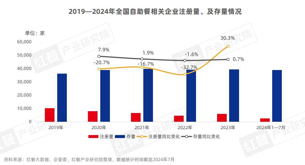 红餐大数据显示,截至 2024 年 7 月,全国自助餐总门店数已超过 6 万家。企业数量方面,近年来自助餐的企业注册量虽波动较大,但企业数量保持着稳中有增的趋势。企查查数据显示,2023 年全国自助餐相关企业注册量近 6,000 家,同比增长 32.7%;2024 年 1 — 7 月,全国自助餐企业注册量为 2,600 余家。