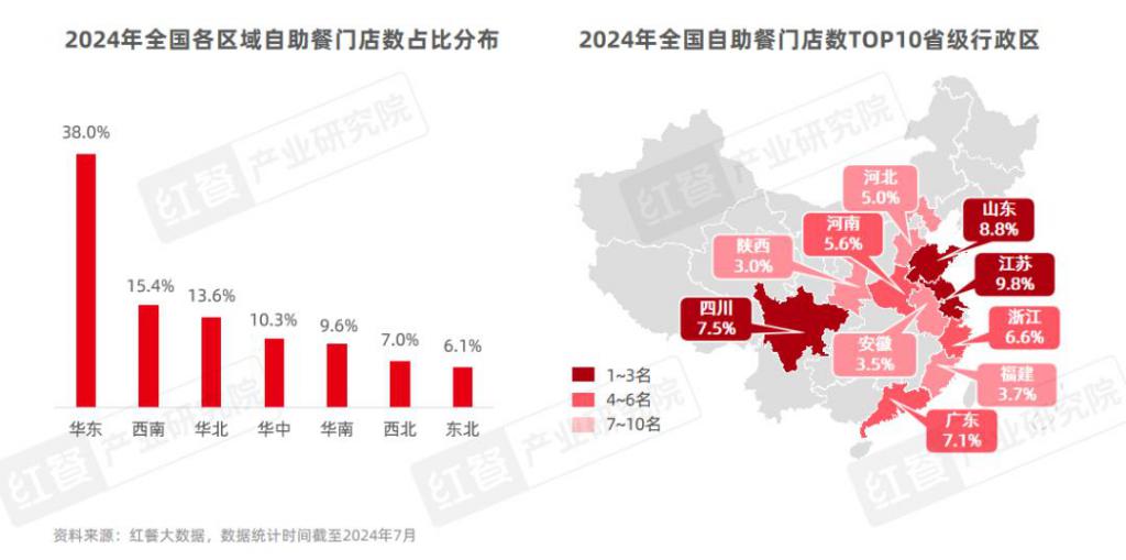 从全国各区域的自助餐门店数分布来看,华东地区的自助餐门店数占比最高,达 38.0%。其次是西南、华北和华中地区,门店数占比均超过了 10%。