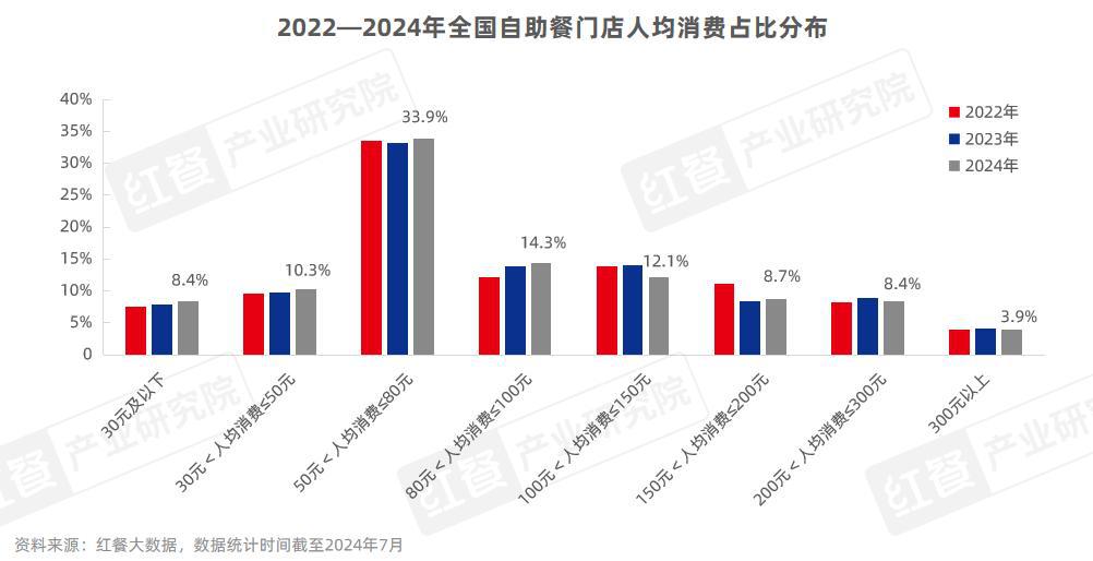 从自助餐的人均消费变化趋势来看,2022 — 2024 年自助餐的人均消费有下滑趋势。红餐大数据显示,截至 2024 年 7 月,全国自助餐人均消费在 80 元及以下的门店数占比为 52.6%,比 2023 年提高了 1.9 个百分点;人均消费在 100 元及以下的门店数占比为 66.9%,比 2023 年提高了 2.4 个百分点。