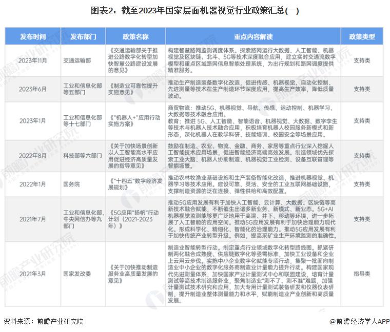 2013 年以来,智能制造的生产模式逐渐推广,智能装备创新发展对制造业越来越重要。《机器人产业发展规划 ( 2016-2020 年 ) 》、《" 十三五 " 国家科技创新规划》等政策规划对工业机器人进行了发展方向指导 ;《新一代人工智能发展规划》、《促进新一代人工智能产业发展三年行动计划 ( 2018-2020 年 ) 》和《国家新一代人工智能开放创新平台建设工作指引》等政策规划在推动人工智能发展中起着重要作用 ;《中国制造 2025》、《加快培育共享制造新模式新业态 促进制造业高质量发展的指导意见》以及《关于推动先进制造业和现代服务业深度融合发展的实施意见》等政策则对制造业做出了重大战略布局。机器视觉是制造业与人工智能结合的关键技术领域,诸多国家政策为机器视觉行业发展提供了良好的政策环境。以下是国家层面机器视觉重点政策汇总: