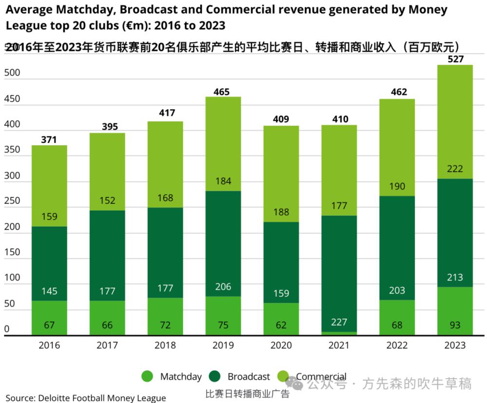 根据德勤对 2022/23 赛季收入最高的前 20 家足球俱乐部的统计,该赛季这 20 家俱乐部报告的平均收入超过 5 亿欧元,商业和转播收入分别贡献了 42%(2.22 亿欧元)和 40%(2.13 亿欧元),其次是比赛日收入占 18%(0.93 亿欧元)。而球员和俱乐部工作人员的工资成本基本都超过了 50%,有些俱乐部甚至超过 80%。尽管收入规模在增长,但支出激增得更多。