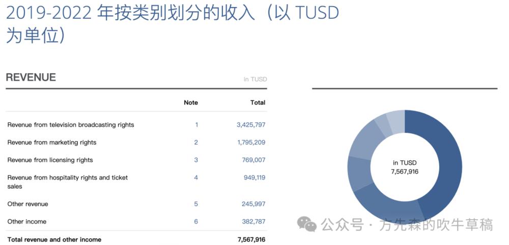 而国际足联在 2022 年卡塔尔世界杯中,获得收入也高达 63.14 亿美金,投入成本仅为 18.31 亿美元。在经历疫情的 2019~2022 年四年周期里创纪录的实现了 76.58 亿美元,环比增长了 18%。数年前玩足球的那帮中国房地产商们,看到这数据后估计会哭晕在厕所。