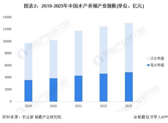 2019-2022 年,中国水产养殖需求保持增长。中国水产养殖产业规模由 2019 年的 9762 亿元提升至 2022 年的 12502 亿元。2023 年中国水产养殖产值规模超 13000 亿元,同比增长 4.49%。
