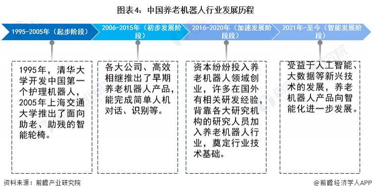 我国养老机器人产业化发展的其最初的源头来自于实验室、科研机构、大学等,关键技术的积累开始与上个世纪 90 年代。1995 年,清华大学开发除了中国第一个 " 七自由度移动式 " 护理机器人。此后近三十年间,我国养老机器人经历了产品方向探索、功能完善、AI 赋能等过程,发展至今。