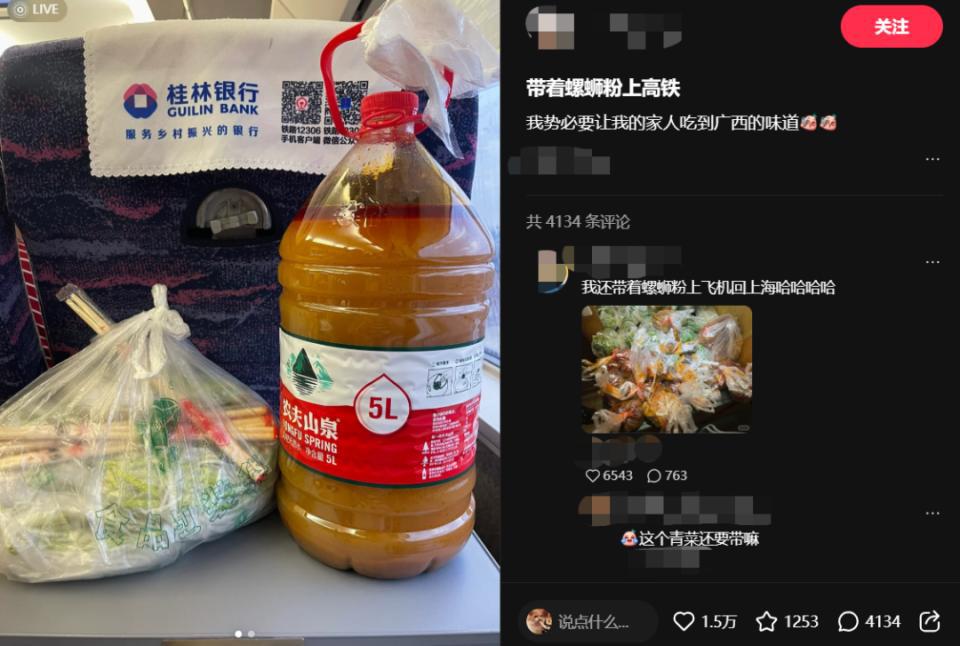 有网友提到,自己在今年 " 双 11" 屯了 80 包螺蛳粉,并且打算在保质期内全部吃光;还有不少螺蛳粉爱好者为了吃到这份 " 原汁原味 " 的酸爽,专门跑去柳州各个螺蛳粉门店打卡,甚至打包一大桶螺蛳粉原料上高铁。