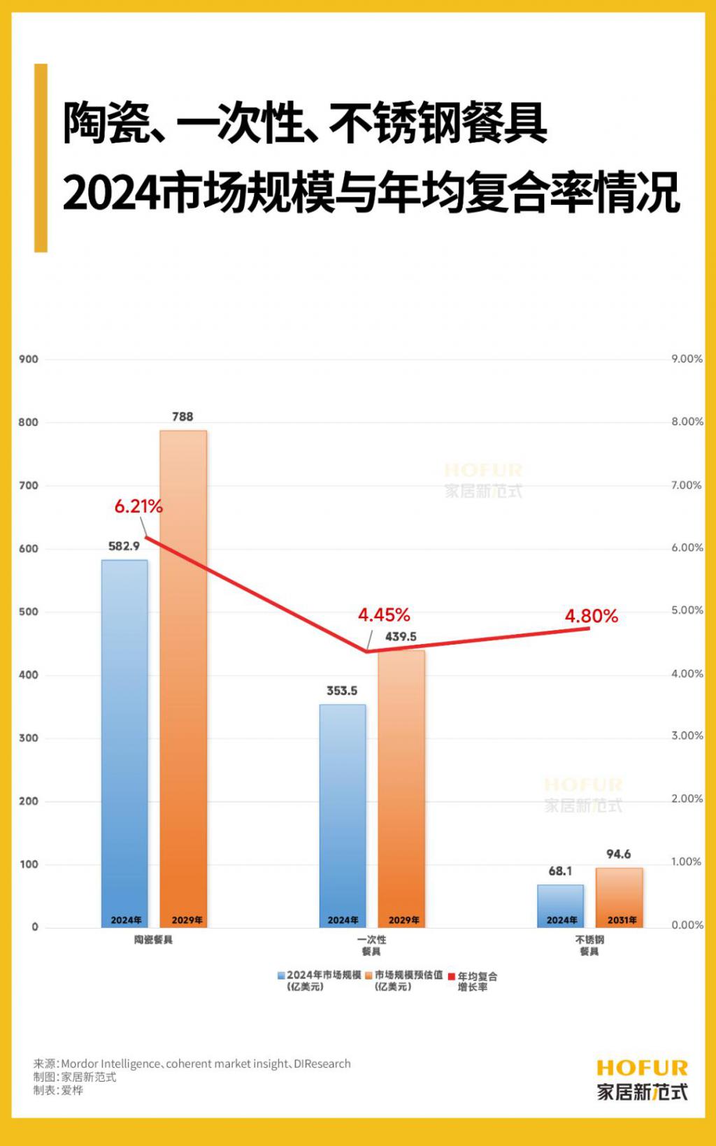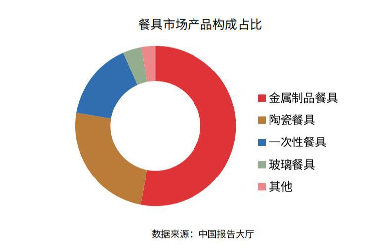 从材质来看,在全球市场占据主导地位的是金属制品餐具,其次是占比超 25% 的陶瓷餐具,主要面向高端市场和家庭用户;而外卖、快餐行业带飞的一次性餐具规模也日益庞大。