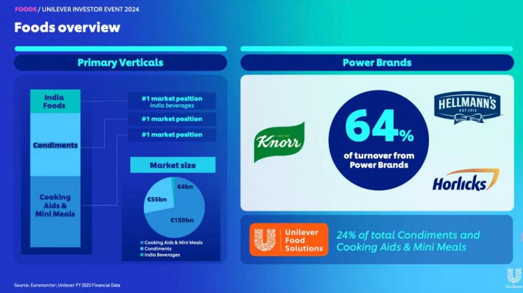 小食代翻查的联合利华 2024 投资者日资料显示,该公司所圈定的重点领域,都是其处于领先地位的行业。资料引用的欧睿国际数据显示,在印度饮料(注:依靠强势品牌 Horlicks)、调味品、烹饪辅料 & 迷你餐食中,联合利华都排名市场第一,这三个市场的规模分别为 40 亿、550 亿、1500 亿欧元。