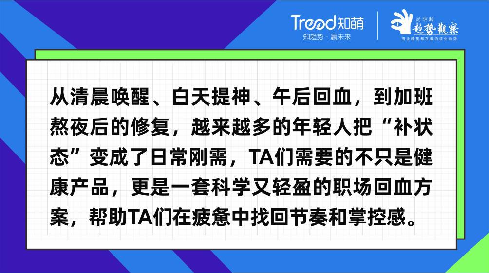 从清晨唤醒、白天提神、午后回血,到加班熬夜后的修复,越来越多的年轻人把 " 补状态 " 变成了日常刚需,TA 们需要的不只是健康产品,更是一套科学又轻盈的职场回血方案,帮助 TA 们在疲惫中找回节奏和掌控感。