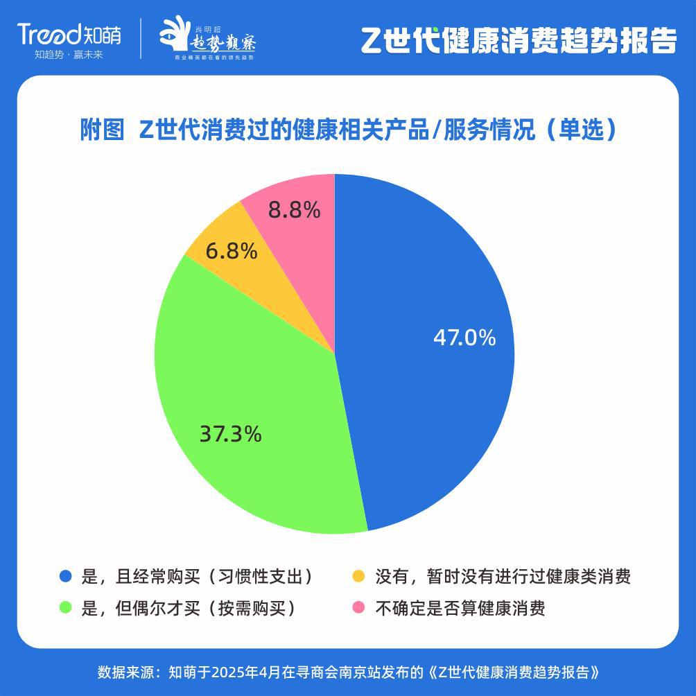 慢性病年轻化的趋势,让 Z 世代按下了 " 健康焦虑 " 快捷键,健康消费不是尝鲜,而是他们的" 习惯性支出 "。报告显示,47% 的 Z 世代消费者经常购买(习惯性支出)健康相关产品,每年平均健康消费支出 3250.7 元。