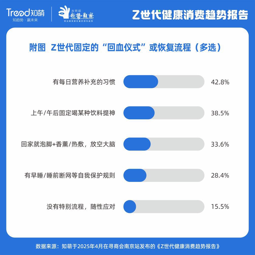 年轻人选择日常" 仪式化精细运营 "。报告显示:42.8% 的年轻人有每日营养补充的习惯;38.5% 的年轻人上午 / 午后固定喝某种饮料提神;33.6% 的年轻人回家就泡脚 + 香薰 / 热敷,放空大脑;28.4% 的年轻人有早睡 / 睡前断网等自我保护规则。此外,从日常状态监测到具体的疲劳缓解、能量补充、睡眠改善,Z 世代对各类 " 打工回血类 " 产品均展现出明显的需求。