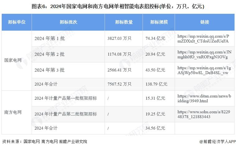 智能电表是智能电网配电、用电环节的关键终端设备之一,对智能电网的安全运行以及居民、商业和工业正常用电发挥着重要作用。中国政府高度重视智能电网投资和建设,出台了一系列政策法规推动行业的发展。近年来,中国 5G 通信技术、高精端计量传感器技术、微处理器技术、电力系统软件技术发展均取得较好成效,在新兴技术的支持下,中国智能电表应用快速普及。国家电网是中国电力公共服务的主要参与者,其智能电表采购需求约占全国市场的 80%。2024 年,国家电网单相智能电表招标规模为 138.79 亿元,南方电网单相智能电表招标规模为 34.56 亿元。