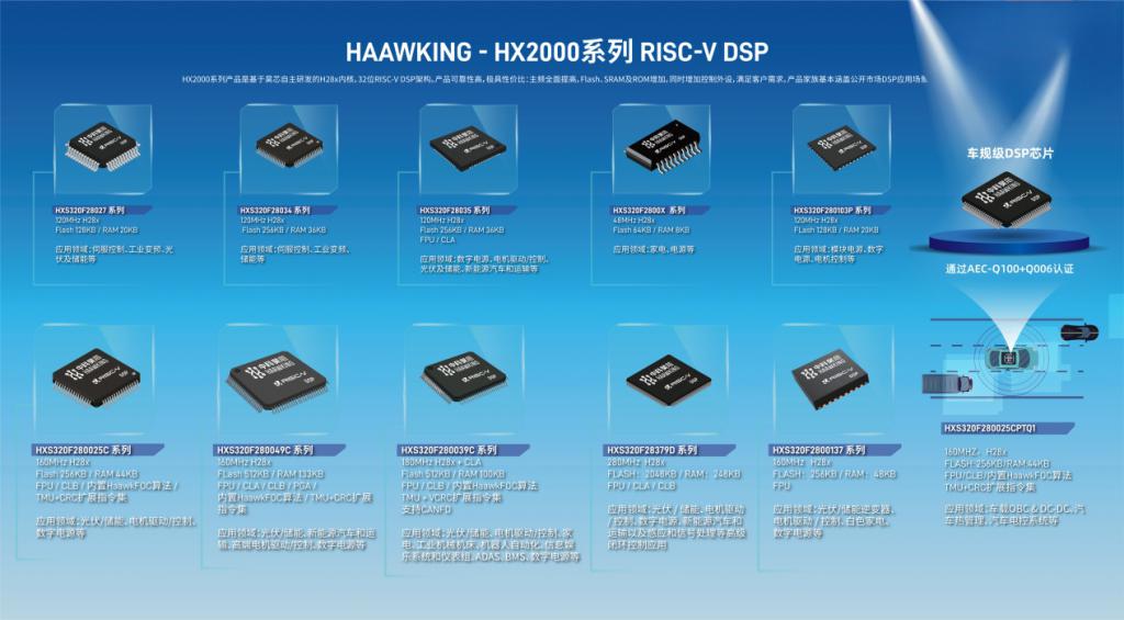 「中科昊芯」从 DSP 的内核到算法均为自主研发,全球首款基于 RISC-V 指令集的 DSP —— Haawking-HX2000 系列,专为工业自动化、光伏储能及数字电源等高实时性场景设计,覆盖车规级 DSP、高性能 DSP、主流 DSP 和高性价比 DSP,可应用于工业控制及电机驱动、数字电源、光伏、储能、新能源汽车、消费电子、白色家电等领域。其中,车规级 DSP 对可靠性要求更高,公司在产品设计上考虑多种安全机制和校验方式,严格筛选供应链,现产品已进入国内头部车企的供应链。
