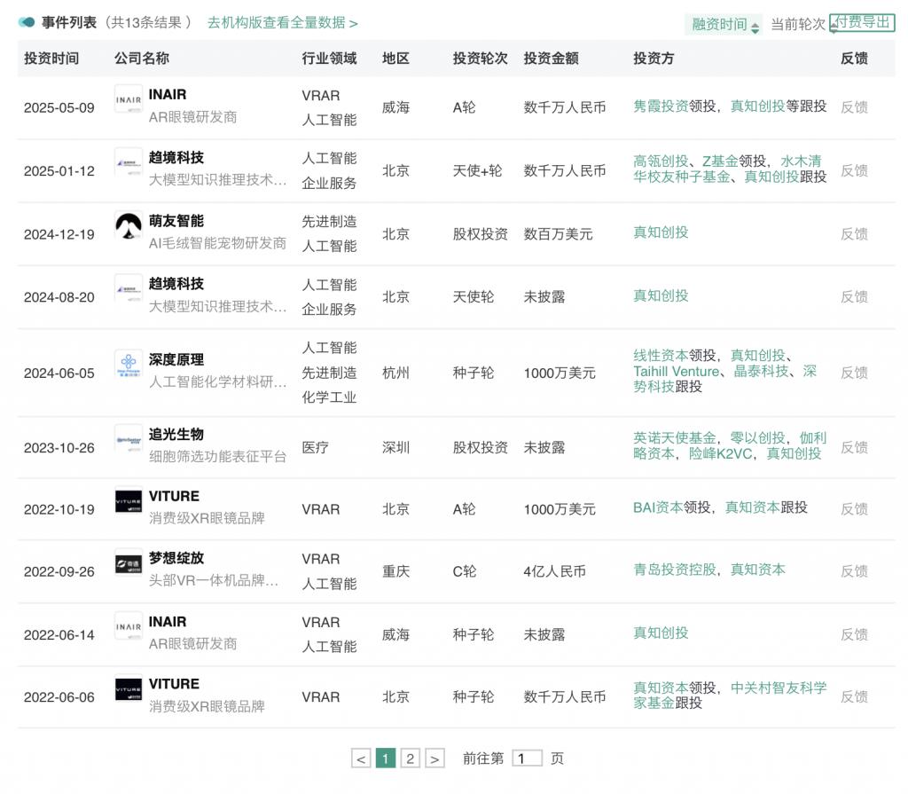 烯牛数据显示,2021 年以来,真知创投共计出手 13 次,先后投资了生命科学 AI 基础模型开发商百图生科、消费级 XR 眼镜品牌 VITURE、大模型知识推理技术服务提供商趋境科技、AR 眼镜研发商 INAIR 等,大多集中在人工智能领域。