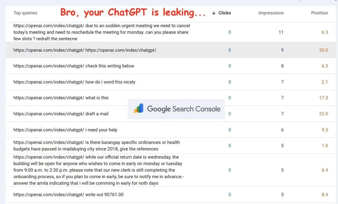 11 月 8 日消息,科技媒体 Ars Technica 今天(11 月 8 日)发布博文,报道称最近几个月,部分 ChatGPT 用户的个人敏感对话内容被发现持续泄露至谷歌搜索控制台(GSC)。