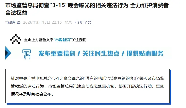 3 月 15 日消息,市场监管总局今晚发文,针对中央广播电视总台“3·15”晚会曝光的“漂白的鸡爪”“增高营销的套路”等涉及市场监管领域的违法行为,市场监管总局迅速启动应急处置机制,部署开展执法行动,...