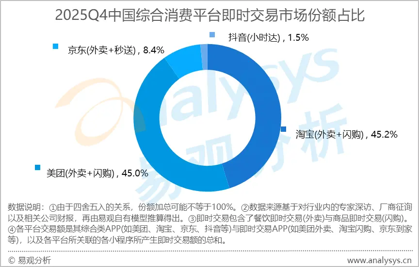3月16日,第三方研究机构易观分析3月14日发布即时零售市场报告显示,2025年第四季度淘宝闪购即时交易市场份额为45.2%,美团为45.0%,两者份额差距仅0.2个百分点;京东即时交易市场份额为8.4%,位列第三。