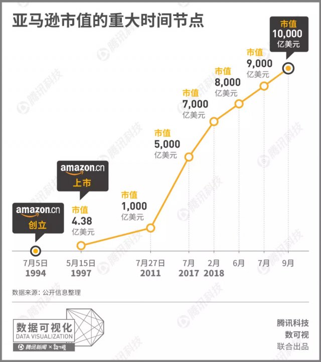 亚马逊创立于 1994 年 7 月,并在 1997 年首次公开募股,IPO 时它的市值为 4.38 亿美元。亚马逊在 2011 年涨破千亿市值之后,市值上升周期明显变短:从 2017 年到 2018 下半年,亚马逊就完成了市值从 5000 亿到一万亿美元的跨越。