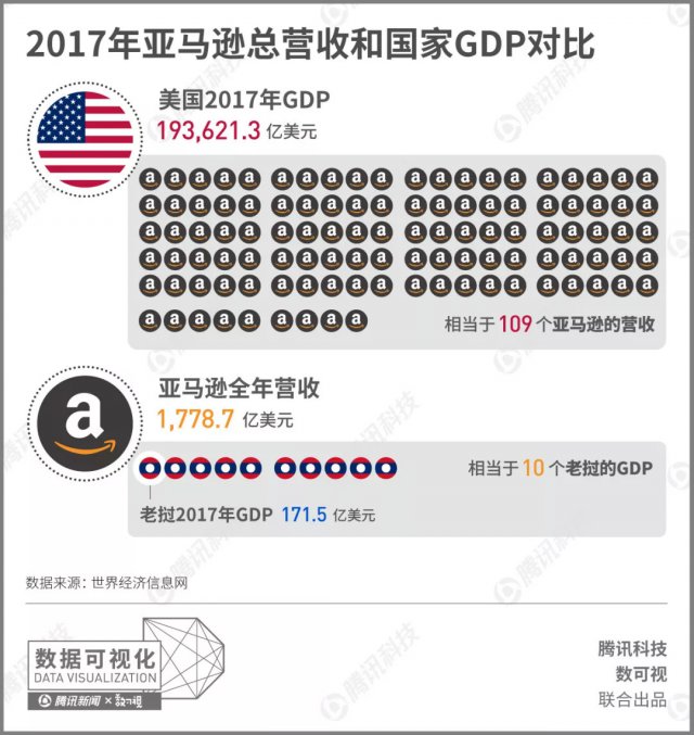 亚马逊在 2017 年的全年总营收达到了 1778.67 亿美元,这个数字有多大?也许用国家 GDP 来对比一下可以帮助你更好地理解这个数字的概念。
