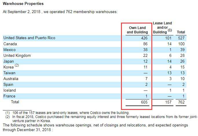2018 财年财报(截止于 2018 年 9 月 2 日)显示,Costco 共有 762 家门店,其中 " 自有 " ——自己拥有土地、建筑物所有权——店铺数量达到 605 家,占比 79.4%。甚至在余下的 157 家租赁的店铺中,106 家只不过是租赁土地,因为建筑物是 Costco 自己的(即图中【小注 1】)。