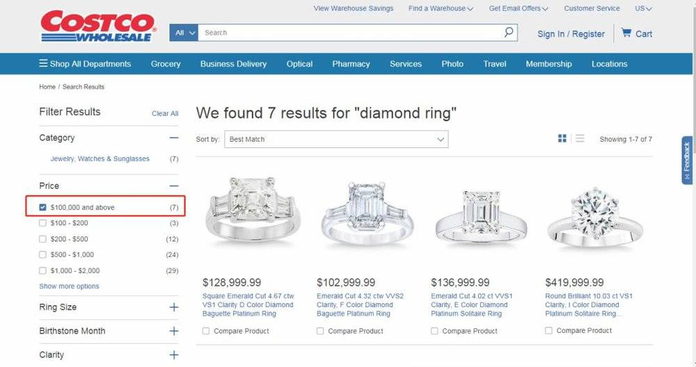 ▲在 Costco 官网上,10 万美元以上的钻石戒指就有 7 款