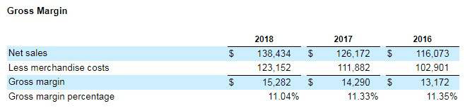 以 2018 财年财报为例,Costco 可以这样理解:假设本财年商品收入为 100 元,此时,商品成本(Cost of Goods Sold)为 89 元,这意味着毛利为 11 元,然后管理费用 10 元左右,最后剩下 1 元。而这 1 元从数字角度说,正好和本年度的税相同,于是相当于从商品角度一分钱没赚。