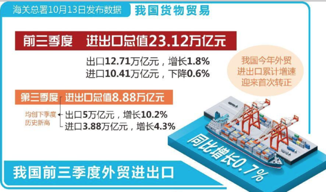 从数据来看,外贸进出后正在逐季回稳,累计增速转负为正。今年一、二季度,我国进出口增速分别为-6.5%、-0.2%,在三季度却迎来了强势复苏,进出口8.88万亿元,同比增长7.5%,其中出口5万亿元,增长10.2%。
