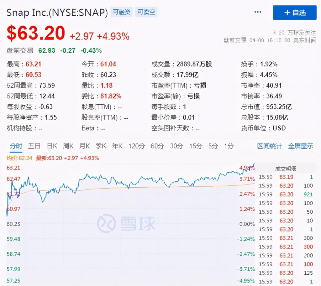 消息一出的当天,Snap 在 4 月 8 日的股价应声大涨,曾上涨近 5%。