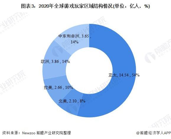 2020 年,在 26.9 亿的全球游戏玩家中,亚太地区玩家人数最多,超过了 14 亿人,约占全球玩家的 54%。其次是欧洲第五玩家约占全球玩家数量的 14%。