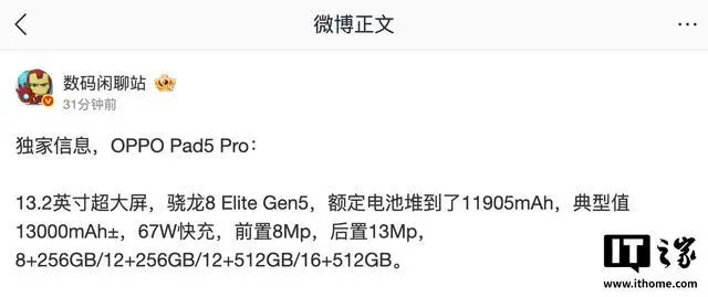 3 月 14 日消息,博主 @数码闲聊站 今天在微博发文,曝光 OPPO Pad 5 Pro 平板的详细参数。