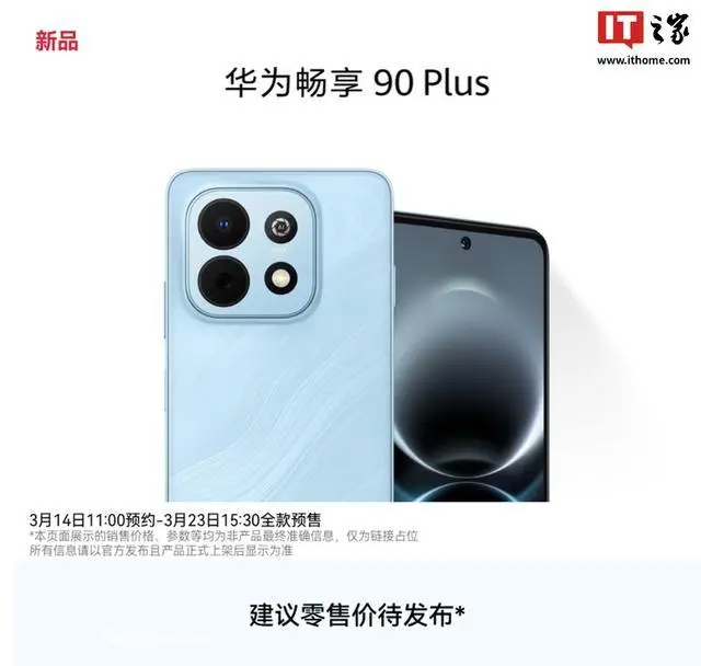3 月 14 日消息,华为畅享 90 Plus、90 Pro Max 手机现已在京东开启新品预约,3 月 23 日 15:30 全款预售,价格尚未公布。