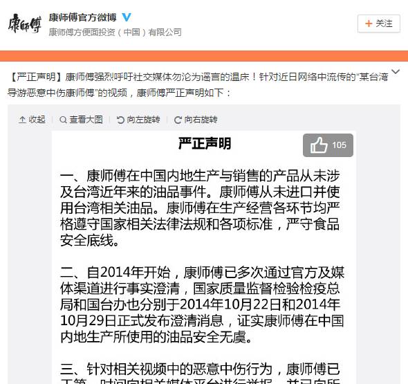 作为普通用户,大叔是从一个微信群里看到这段视频的,粗略回想了一下,大叔至少在五个微信群里看到有人分享。视频的内容,就是一位台湾女导游在巴士车上的一段话,核心内容就是说康师傅的质量问题,其中一句话印象深刻:“康**在大陆使用的馊水油数量是台湾的56倍。”此外,还有“灭顶运动”这个词。