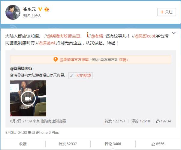 这段视频到底是怎么流传到大陆的,大叔猜测可能是某位大陆游客到台湾旅游,无心之下录制的,然后发到了微博或微信上。没想到,短短几天,引爆了社交媒体。大叔在微博上看到,这条视频被包括崔永元在内的不少大V转发,可能是引爆点。而由于微信的封闭性,无法统计这条视频的点击率,大叔看到有媒体报道说“这段2分钟的视频影响人数超过300万”,不知道数据是从哪里来的,但从侧面也能说明确实是火了。