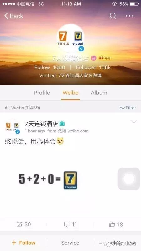 有过“看完速7去速8”,7天这个数字游戏玩的恰到好处。大叔看到官方微博进行了转发(后来自行删除,可能因为导向问题),大叔预计,这样的神图应该不是出自7天,而是来自民间,只不过官方借势了。这张图今天被刷屏了,可见,段子和一张图的传播威力依旧。