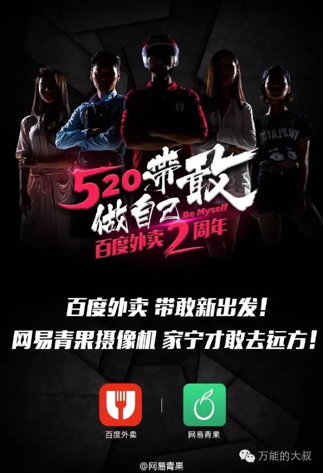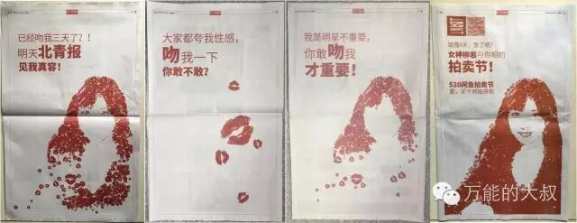 双十一被打造成全球第一大购物狂欢节后,520被阿里瞄上,想要打造成拍卖节,于是在《北京青年报》上投了4天整版悬念海报,并邀请邓超、柳岩、张卫健、陈晓、蔡康永等明星来造势。
