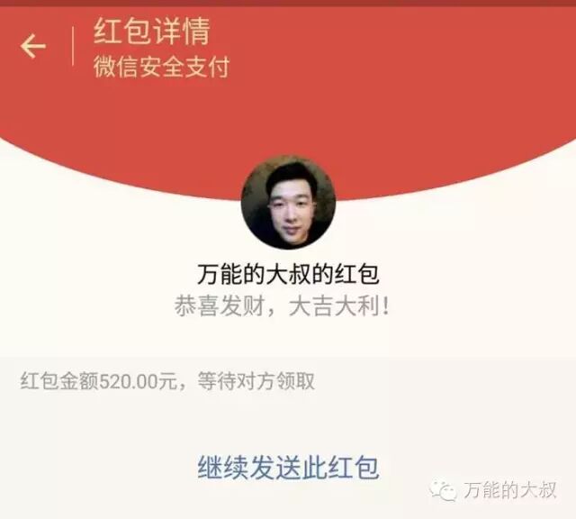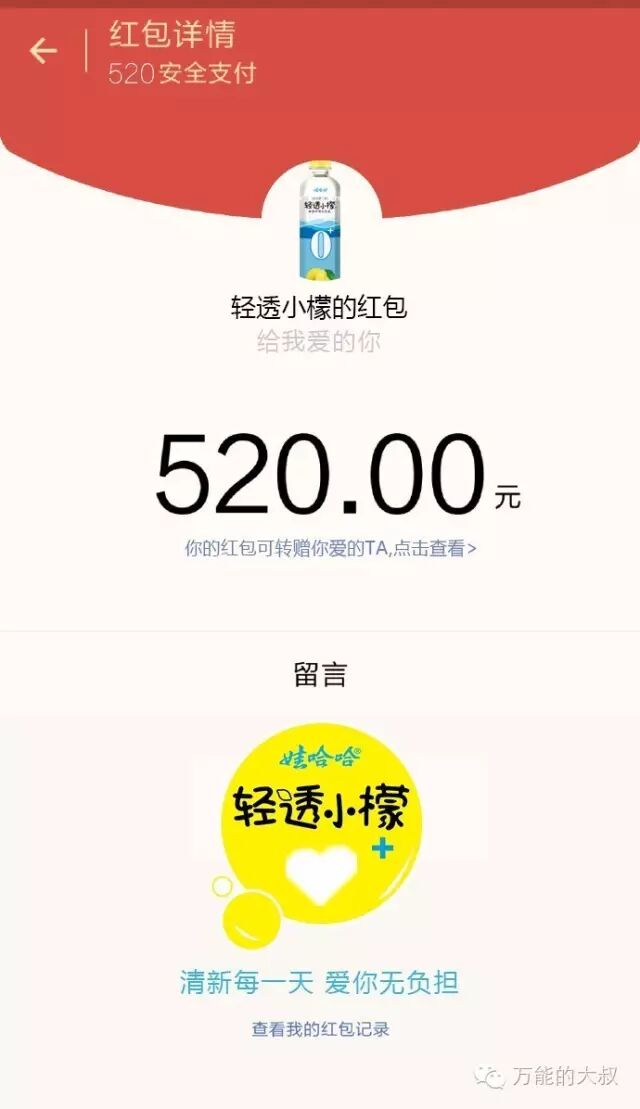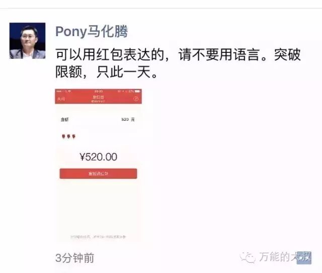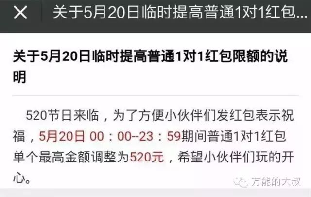 5月20日00:00—23:59期间普通1对1红包单个最高金额调整为520元,本着好奇,大叔一开始以为是谣言,后来尝试了一下,是真的。微信如此低调,估计是怕给银行的手续费太高吧。