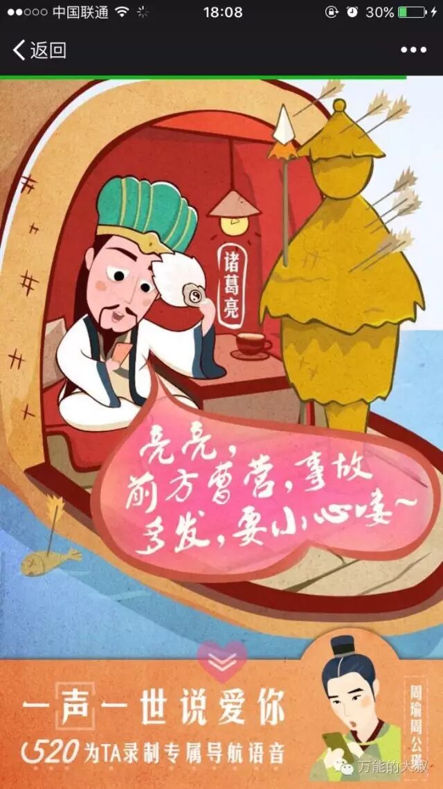 发布“520导航语音私人定制”H5,诸葛亮、唐三藏、尔康结合人物台词发起“诱导总攻”。