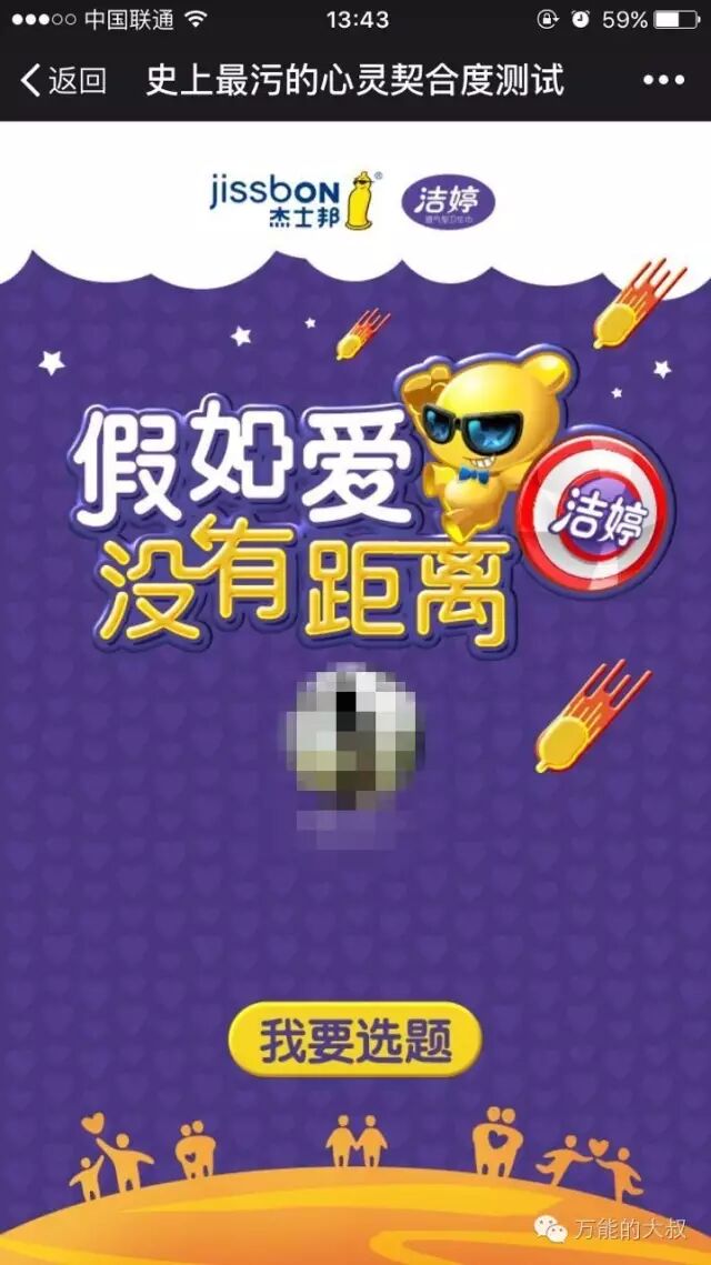 杰士邦联合洁婷发布“假如爱没有距离”的史上最污的心灵契合度测试和“拉邦洁派,让爱没有距离”的H5小游戏,简单易上手,参与度高。