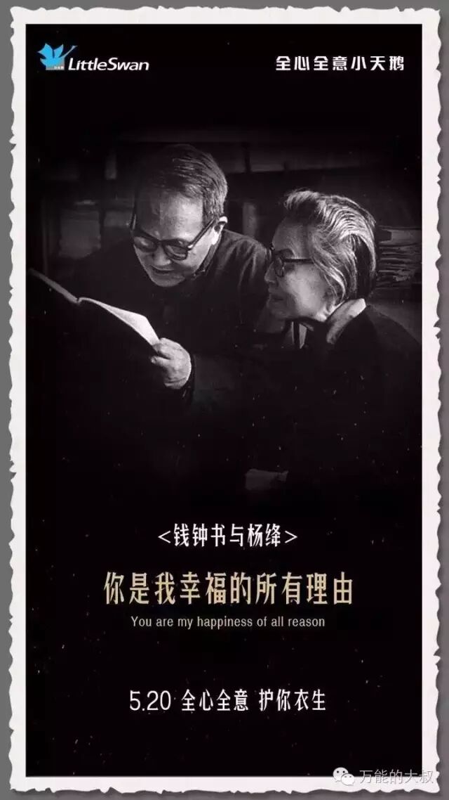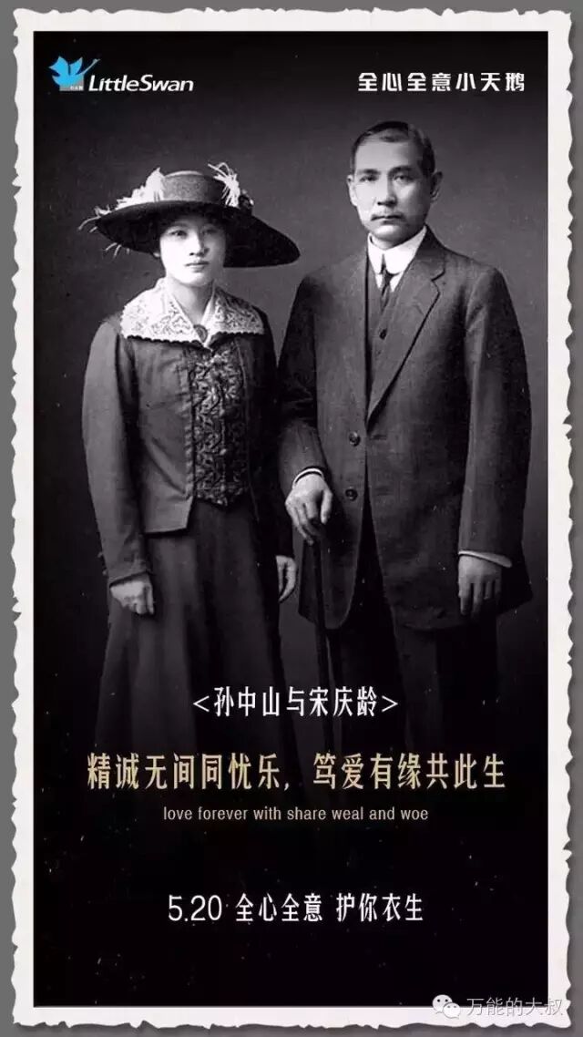 用孙中山与宋庆龄、梁思成与林徽因、钱钟书与杨绛的爱情表达“全心全意、护你衣生”。