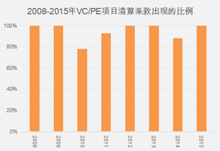 上文解释了什么是优先清算权、优先清算倍数是怎么一回事。创业者会问,所有的TS里面都会有优先清算权么?一般来说多少的优先清算倍数比比较常见呢?这边引用何明科在知乎《用数据化的方式解析投资条款之九:清算》里面的数据,让大家有个比较直观的概念。