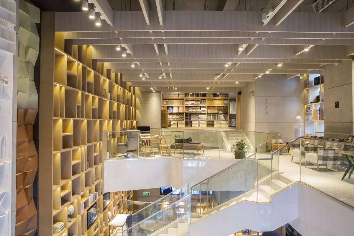 这是严选酒店的大堂,共有三层,整体延续严选一直以来的北欧“极简”风格,除了陈列一部分严选的商品如毛巾、衬衣、小风扇等,只有少数几件家具。屋顶横梁间的小灯散发的柔和黄色灯光暖暖照在整个大堂,四周是摆放着严选商品的规整木制储物柜,厅中央放置清秀的格纹布艺沙发、木制小矮几,点缀着几盆绿植。