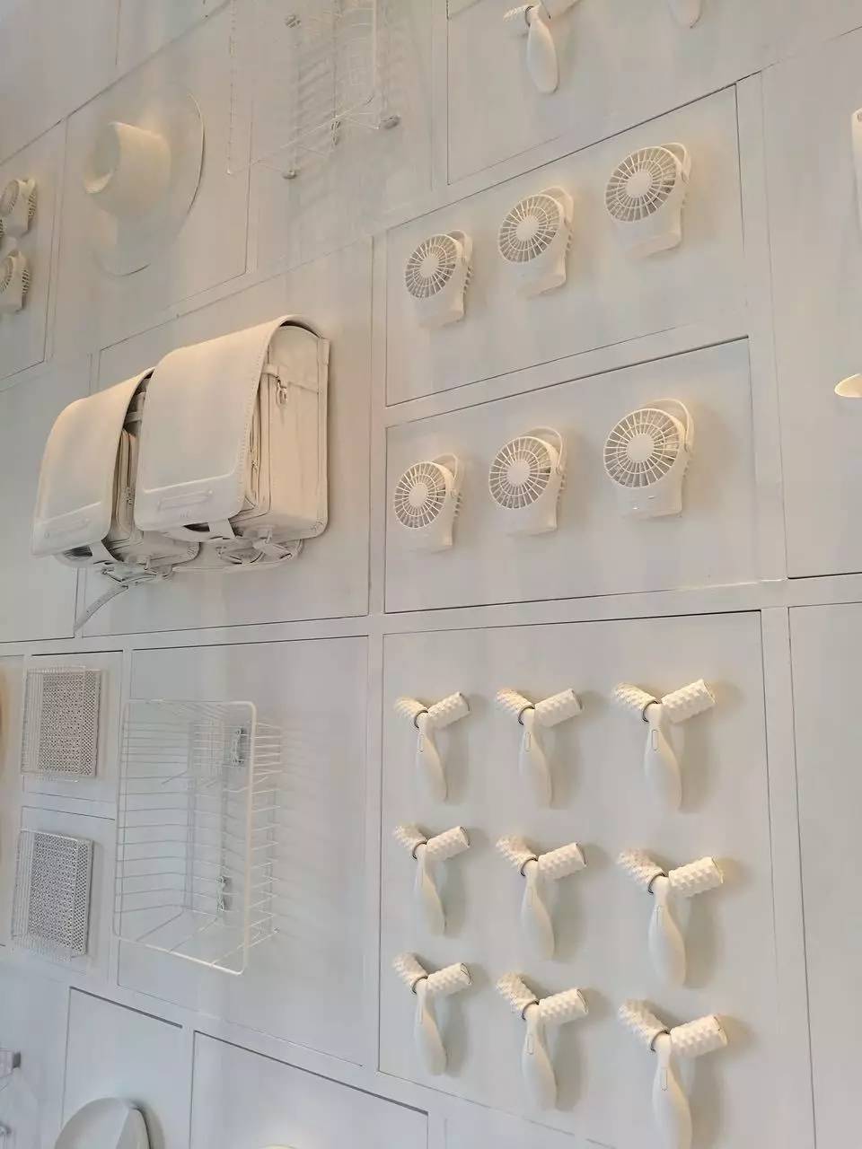 在大堂一角像布景一样杂糅着的储物筐、帽子、风扇的墙