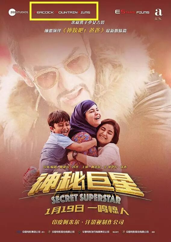 与以往引进内地的印度电影不同,今天上映的《神秘巨星》身份也有所改变,从前的印度电影进入内地市场一直是走批片名额,这一次《神秘巨星》是以分账片形式引进,同时影片背后也有中国资方的身影出现,在影片海报上印有孔雀山影业的公司名,与印度出品方Zee Studios、Aamir Khan Productions Ltd.(阿米尔·汗制作有限公司)并列。