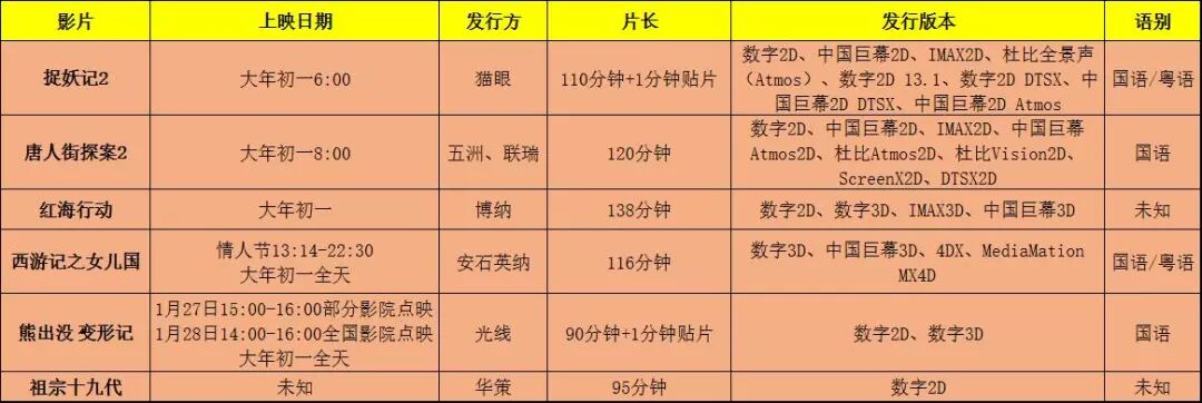 一部影片的发行通知含盖了该部影片所有的基本信息,我们主要探究春节档影片的上映日期、发行方、片长、发行版本、语别等几个维度,从这几个维度大致能反应给出片方前期发行策略上的部署。