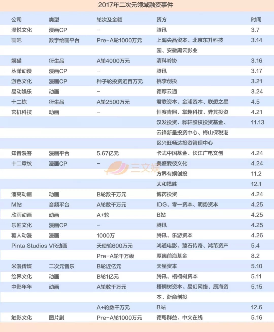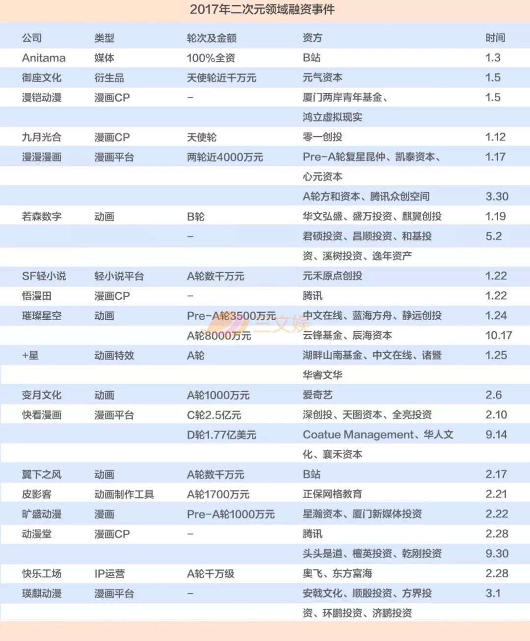 2017年,腾讯、光线、奥飞等上市公司,仍然持续关注着二次元领域,B站也加大了布局力度。据三文娱不完全统计,2017年二次元领域共有93家公司完成了107笔融资,与2016年的108笔数量相当,其中12家公司获得了超过一轮融资,具体融资情况如下: