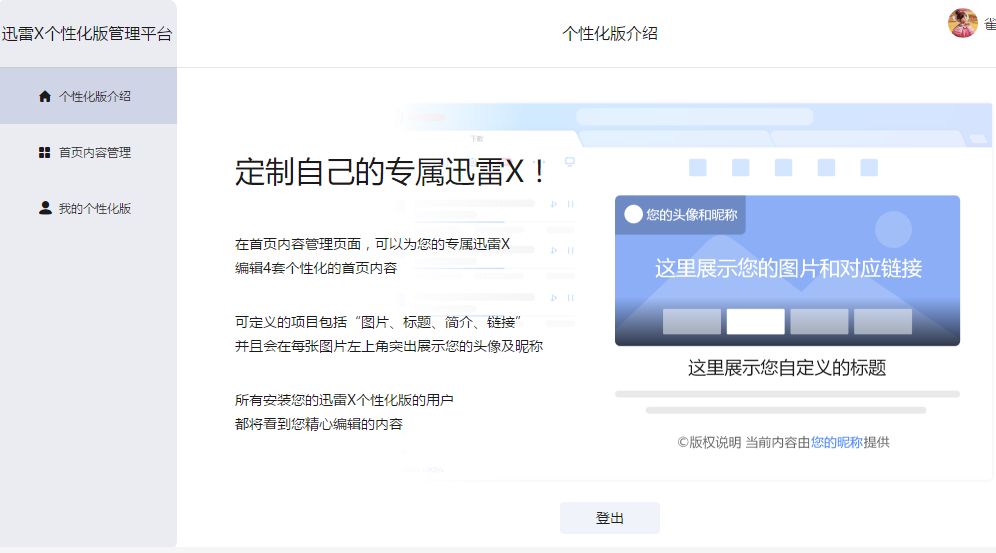 用户可以拥有自己的迅雷X个性化版,并且让所有安装您的迅雷X个性化版的用户,都将看到您精心编辑的首页内容。这对在互联网上拥有众多粉丝的用户来说,确实拉近了用户与粉丝之间的距离,不单纯是下载需求,更进一步赋予情感了。