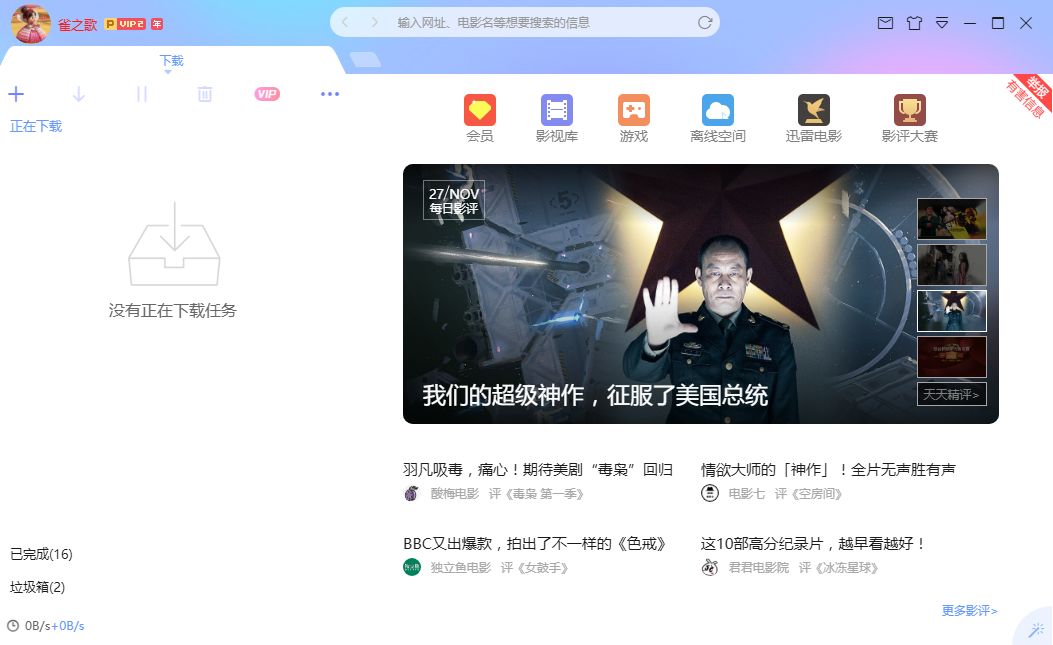 升级换代后的迅雷X正式版采用Electron软件框架完全重写了迅雷主界面,可以完美支持2K、4K显示,采用的配色也很“高级”,可以说是一种简约美。右侧轮播图也没有再做多余的广告,而是升级成了影评空间,用户自发创作并上传的影评,挑选其中好评较高的内容推荐给大家,有助于用户找到更多心仪的电影。