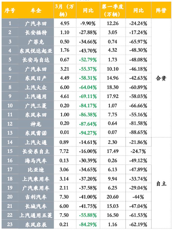 而据时代财经统计已发布的 23 家车企产销数据发现,销量榜同比全线飘绿,仅广汽丰田同比下滑幅度控制在一位数,其余均呈现双位数下跌态势。其中,包括东风雷诺、东风启辰、神龙、上汽通用五菱、长安马自达等 11 家车企跌幅超 5 成。